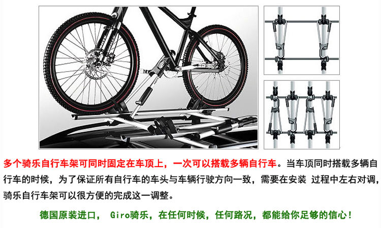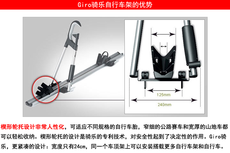 楔形輪托設(shè)計非常人性化,可適應(yīng)不同規(guī)格的自行車胎,窄細的公路賽車和寬厚的山地車都可以輕松收納。Giro騎樂,采用最穩(wěn)固的三角形雙支臂結(jié)構(gòu),更緊湊的設(shè)計:寬度只有24cm同一個車頂架上可以安裝搭載更多自行車架和自行車,有時候,車頂安裝一個車頂箱以后,剩余的尺寸可能只有20公分多一點,那么Giro就是最理想的選擇了。