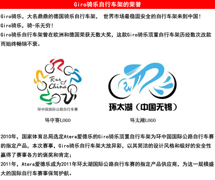 Giro騎樂,最好的頂置自行車架,同時也是環(huán)中國國際公路自行車賽指定使用的自行車架。德國的設(shè)計師認為,好的產(chǎn)品一款就夠了,因此他們致力于打造世界最穩(wěn)固安全的自行車架,Giro騎樂自行車架曾在歐洲和德國榮獲無數(shù)大獎。對安裝在車頂?shù)淖孕熊嚰軄碚f,安全性、便利性和美觀性永遠是設(shè)計過程中最關(guān)鍵的三大因素,當(dāng)三種因素?zé)o法同時兼顧的時候,德國設(shè)計師給出了他們的原則:客戶的安全和便利永遠是最重要的,而美觀與否則因?qū)徝姥酃舛āU枪牡聡O(shè)計師固執(zhí)的堅持這一理念,這款頂置自行車架Giro騎樂才會歷經(jīng)數(shù)次改款而始終暢銷不衰,“我不知道這算不算世界最好的自行車架,但是我敢說,這一定是迄今為止世界上最安全和最高質(zhì)量的頂置自行車架!”設(shè)計師的話謙虛中帶著十分的自信,這款產(chǎn)品從設(shè)計構(gòu)思到生產(chǎn)加工,全部源自德國,值得一提的是,德國的高速公路沒有限速,德國也擁有世界上最苛刻的產(chǎn)品質(zhì)量檢測標準和安全認證標準。對于客戶來說,在選擇車頂自行車架的時候,還有什么比安全性更重要呢?