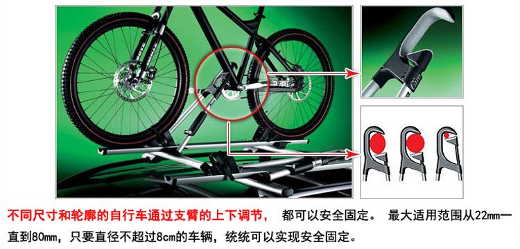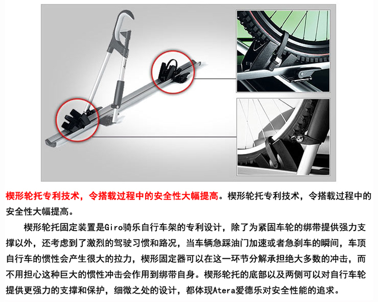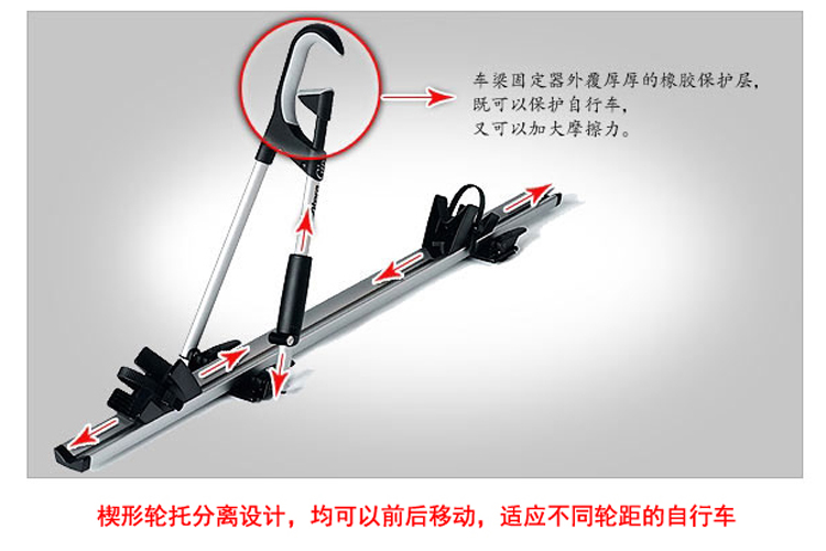 楔形輪托的采用屬于專利技術(shù),安全性大幅提高。 前后車輪部位的楔形固定裝置,兩個楔形固定器分別位于前輪的后部和后輪的前部,除了為緊固車輪的綁帶提供強力支撐以外,還考慮到了激烈的駕駛習(xí)慣和路況,當(dāng)車輛急踩油門加速或者急剎車的瞬間,車頂自行車自身的慣性會產(chǎn)生很大的拉力,楔形固定器可以在這一環(huán)節(jié)分解承擔(dān)絕大多數(shù)的拉力,而不用擔(dān)心這種巨大的慣性會作用到綁帶自身。楔形輪托分離設(shè)計,均可以前后移動,適應(yīng)不同輪距的自行車。