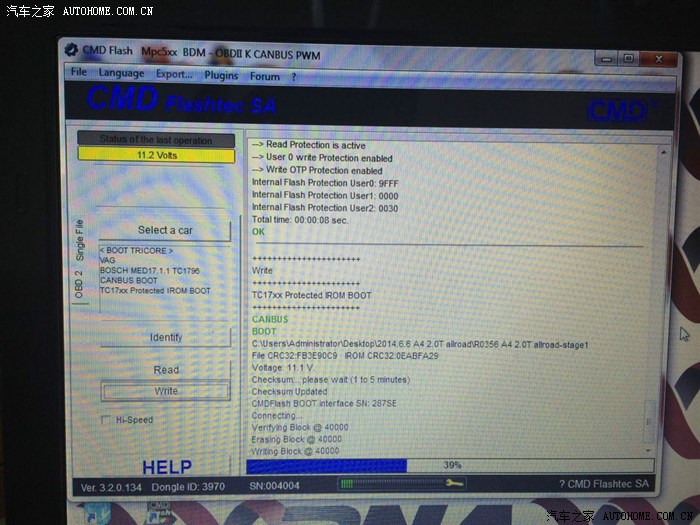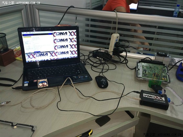 電腦板在發(fā)動機倉擋風(fēng)玻璃下面,這款車采用防調(diào)校系統(tǒng),拆下ECU以后,用專業(yè)工具將電腦板撬開,然后焊接上跳線,連接上DNA-TUNING專業(yè)設(shè)備,打開設(shè)備驅(qū)動,選擇好車型,準(zhǔn)備讀取原車數(shù)據(jù)。