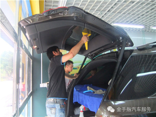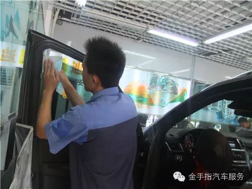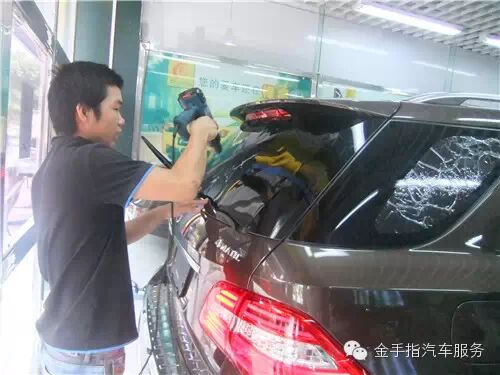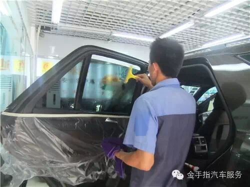 把裁好的窗膜貼至車窗上之后把窗與膜之間的水分與氣泡擠出