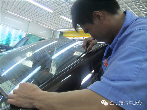 對(duì)貼好的窗膜進(jìn)行修飾,專業(yè)的貼膜技師小心的把多余的膜邊裁剪出來(這是個(gè)細(xì)活)需小心