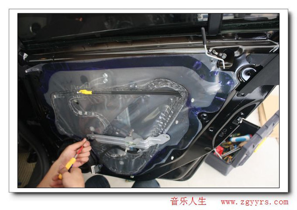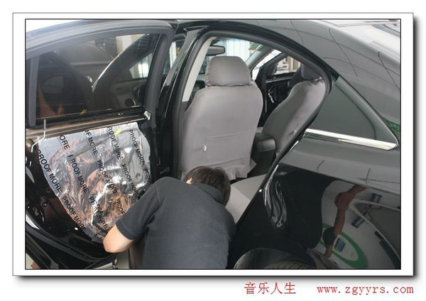 內側隔音開始施工,采用最先技術的條形貼法,最大限度的達到減震隔音的目的。
