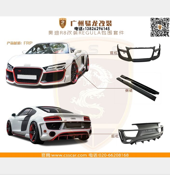 奧迪R8改裝REGULA套件 材料:FRP 包括:前杠 后杠 側(cè)裙 公司網(wǎng)址:www.csscar.com 公眾微信號:csscar 手機(微信):13826296145 扣扣:2093397277 奧迪R8改裝REGULA套件