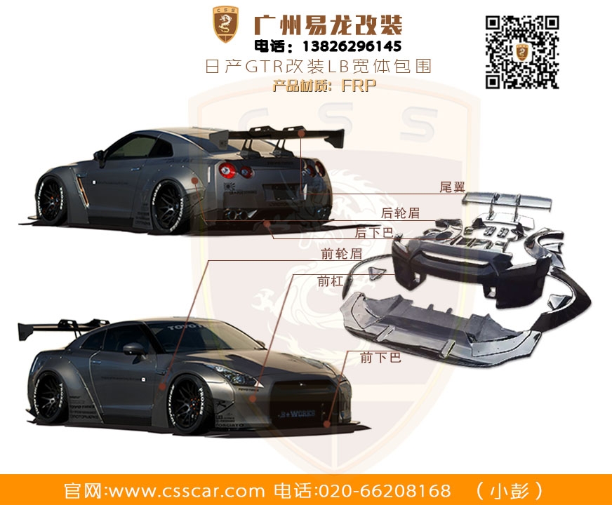 日產(chǎn)GTR改裝LB寬體包圍 材料:FRP 包括:前杠 前下巴 后下巴 尾翼 前后輪眉 公司網(wǎng)址:www.csscar.com 公眾微信號:csscar 手機(jī)(微信):13826296145 扣扣:2093397277 日產(chǎn)GTR改裝LB寬體包圍