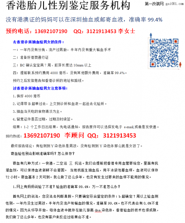 香港驗血測性別報告怎么查詢真假?香港dna抽血鑒別男女胎兒性別費用多少?打不開請點百度快照136.9210.7190 李顧問 騰訊Q:3121.913453 預約香港驗男女4000港幣 香港性別鑒定醫(yī)療 微信號li136-9210-7190 服務項目: ...