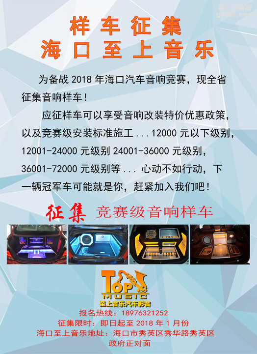 正文摘要:為備戰(zhàn)2018年??谄囈繇懜傎?,現(xiàn)全省征集音響樣車!應(yīng)征樣車可以享受音響改裝特價優(yōu)惠政策,以及競賽級安裝標(biāo)準(zhǔn)施工... 12000元以下級別 12001-24000元級別 24001-36000元級別 36001-72000元級別等... 心動不如行 ... |