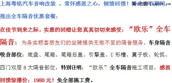 親愛的小伙伴們,上海粵銘汽車音響·非常城市汽車影音連鎖機(jī)構(gòu)時(shí)至佳節(jié),特推出重磅特惠活動(dòng):頂級汽車音響改裝品牌,如丹麥·丹拿 意大利·歐迪臣 美國·JBL美國·燕飛利士等國際頂尖知名品牌最低至88折起裝上車! ...