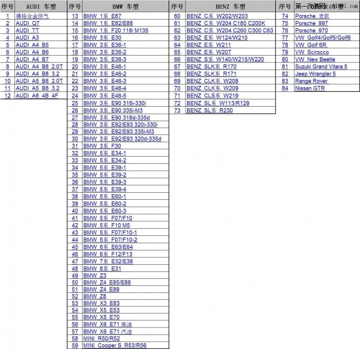 北京無(wú)盡車(chē)域出售德國(guó)Eisenmann排氣 以下是車(chē)型對(duì)照表,圖片太多我就不上傳了,有興趣的朋友聯(lián)系我們無(wú)盡車(chē)域 微信WJCY1990