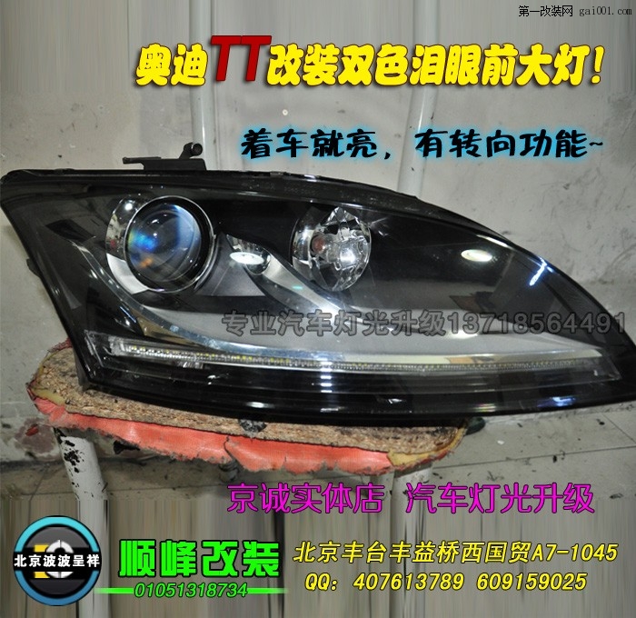 奧迪TT改海拉3雙光透鏡淚眼大燈 北京波波呈祥專業(yè)燈光升級 無需改線,直接對插。無破壞的原裝位改裝,波波呈祥專業(yè)改燈為您照亮回家的路 北京豐臺豐益橋西國貿(mào)汽配城A7-1045 電話:13718564491 QQ:39322 ...
