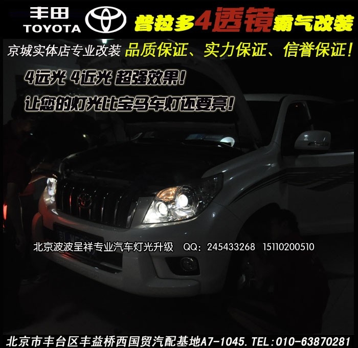 豐田普拉多改四透鏡氙氣燈 北京波波實(shí)體店改裝 體現(xiàn)四遠(yuǎn)二近效果 近光更寬更均勻 遠(yuǎn)光更遠(yuǎn)更強(qiáng)悍即可擁有高配車氙氣燈的外觀和高亮燈光電話:15110200510QQ:245433268 ...